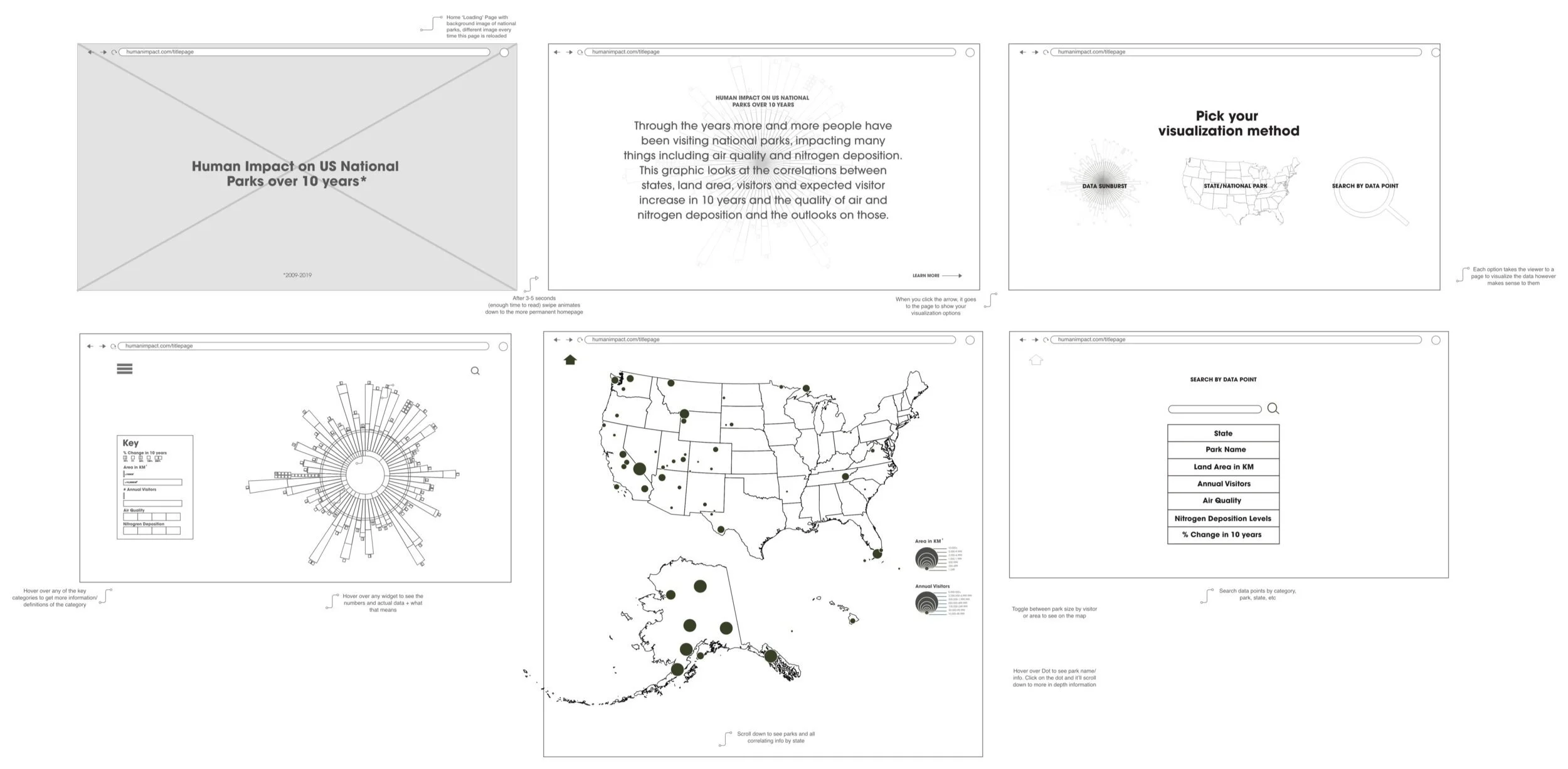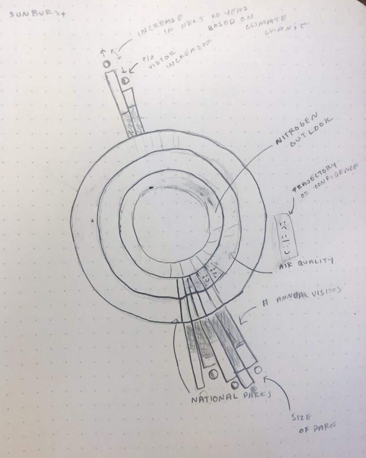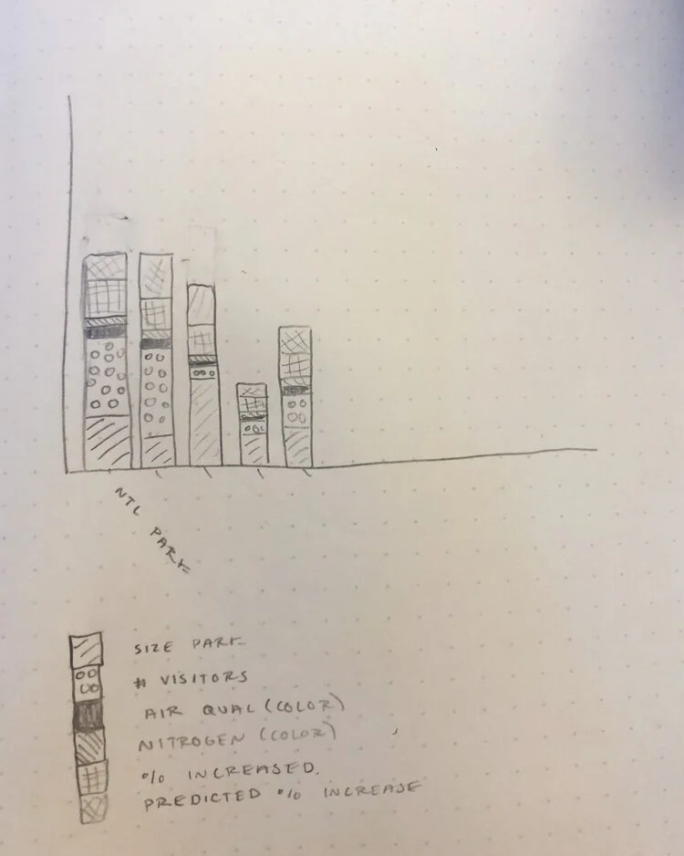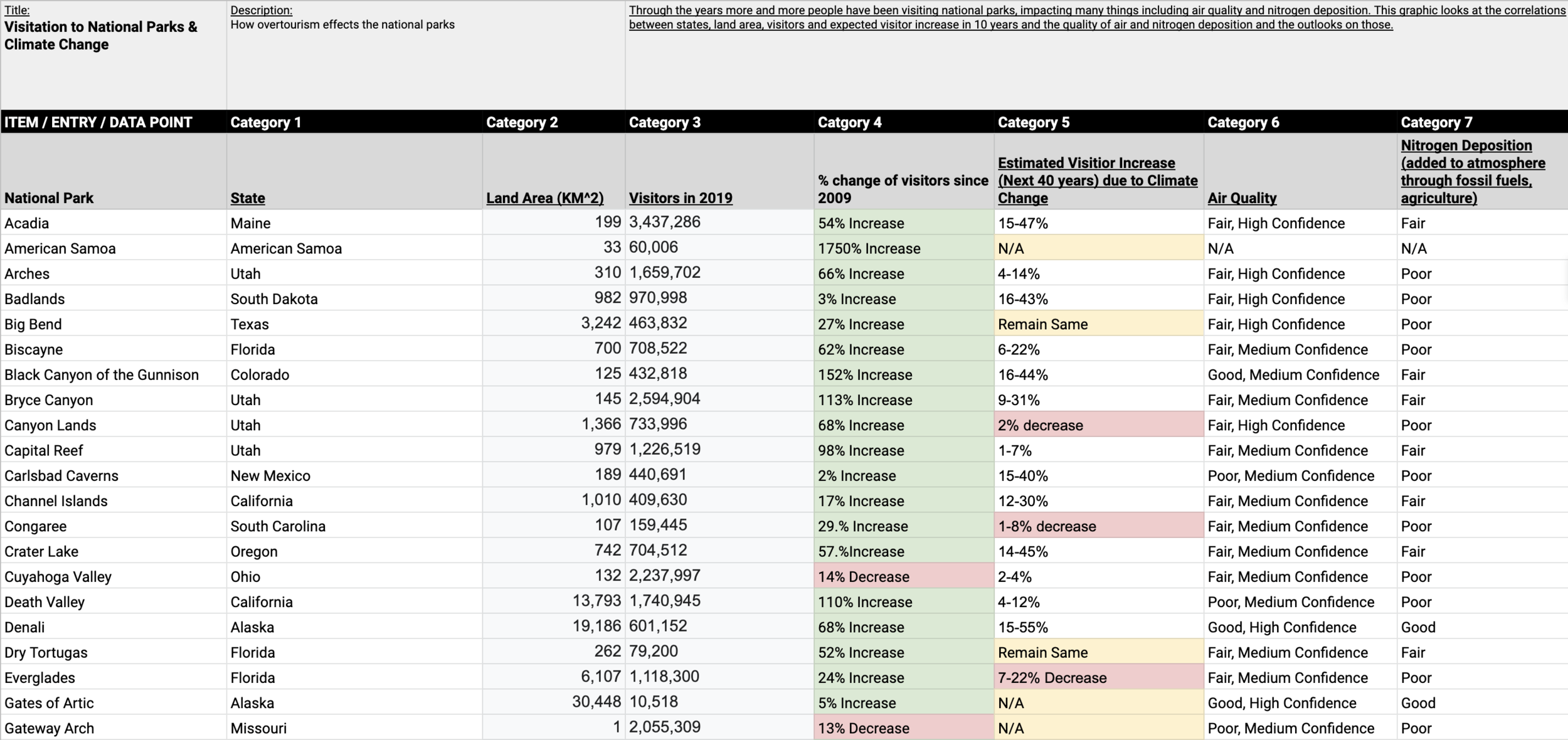 In 2019 US National Parks had nearly 330 million visitors, up 45 million in 10 years and visitation is only projected to increase. While the accessibility to national parks to everyone was a goal of the park system, these fragile lands cannot withstand the number of visitors. The parks most affected are those that see high visitation and have smaller areas and those that are closer to cities and are in more densely populated areas, though there are other factors as well. This data visual looks at the relationship between land area, visitation, air quality, the outlook on nitrogen deposits and the 10 year increase and projected increase for each park.
